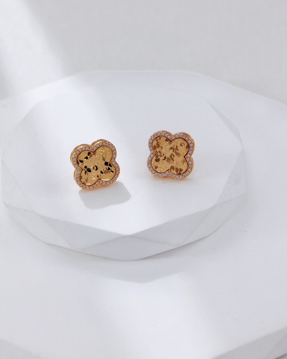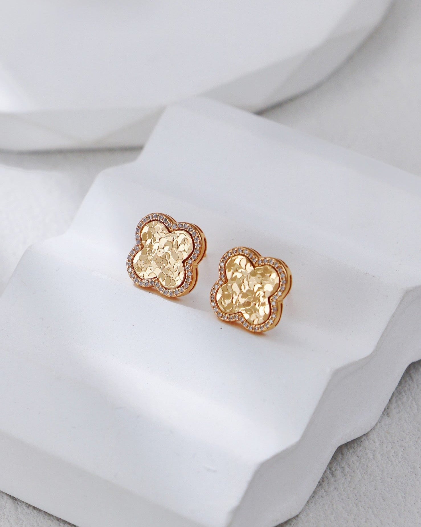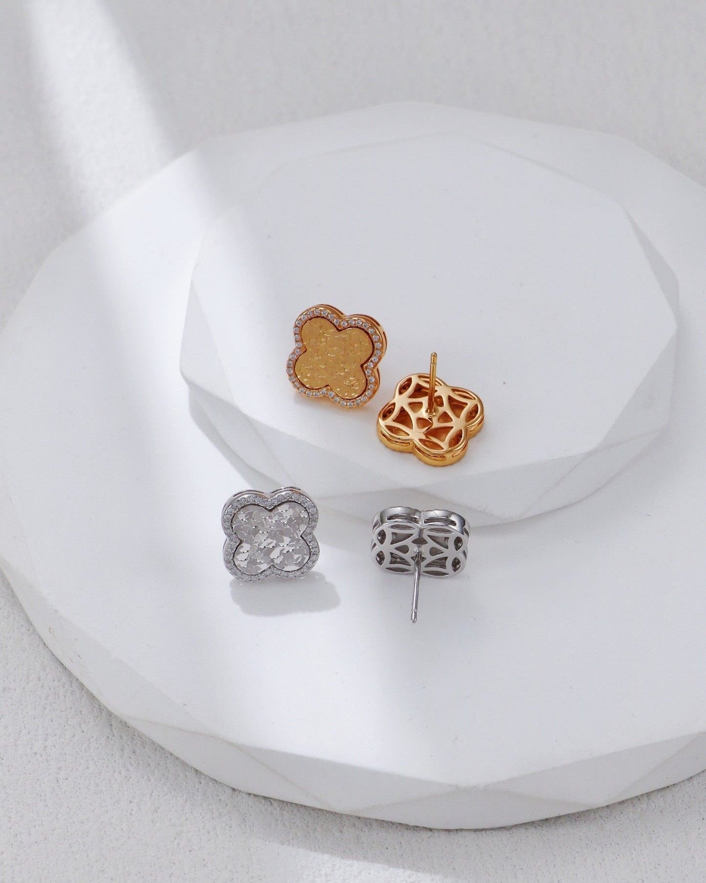 Each clover is meticulously framed with high-grade pavé-set zirconia. This shimmering outline adds depth and creates a perfect visual contrast between the "strength" of the textured metal and the "softness" of the stones.
